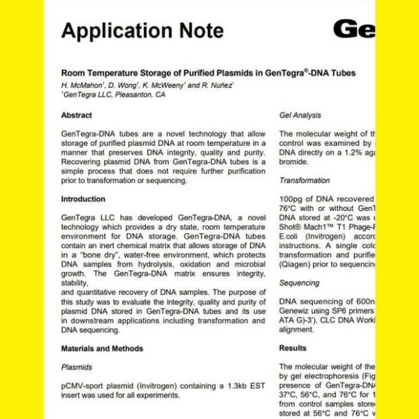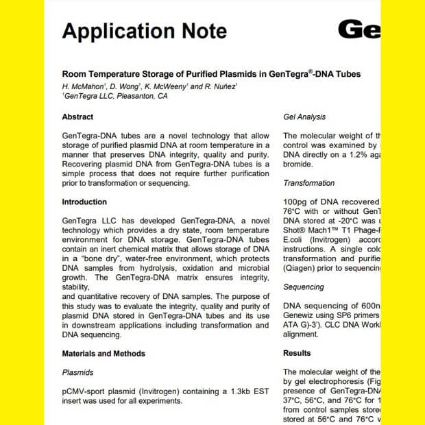 Thanks to GenTegra, that isn’t the case anymore. Their DNA tubes can store DNA at room temperature without causing any harm or impact on the sample. This app note discusses the effectiveness of the GenTegra-DNA tubes in an experiment by GenTegra.